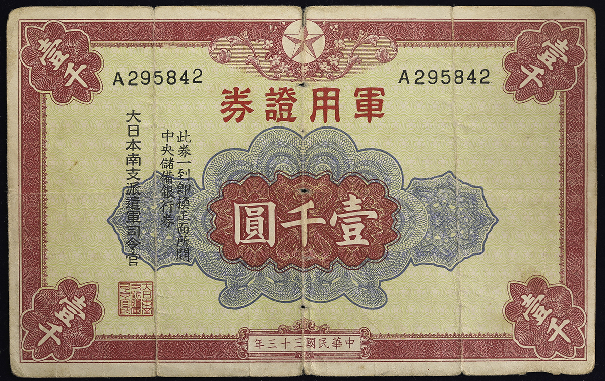 大日本南支派遣军军用证券 South China Expeditionary Army 1000圆(Yen) 民国33年(1944) 返品不可 要下见 Sold as is No returns (VG)劣品。P-M30A,返品不可 要下见 Sold as is No returns