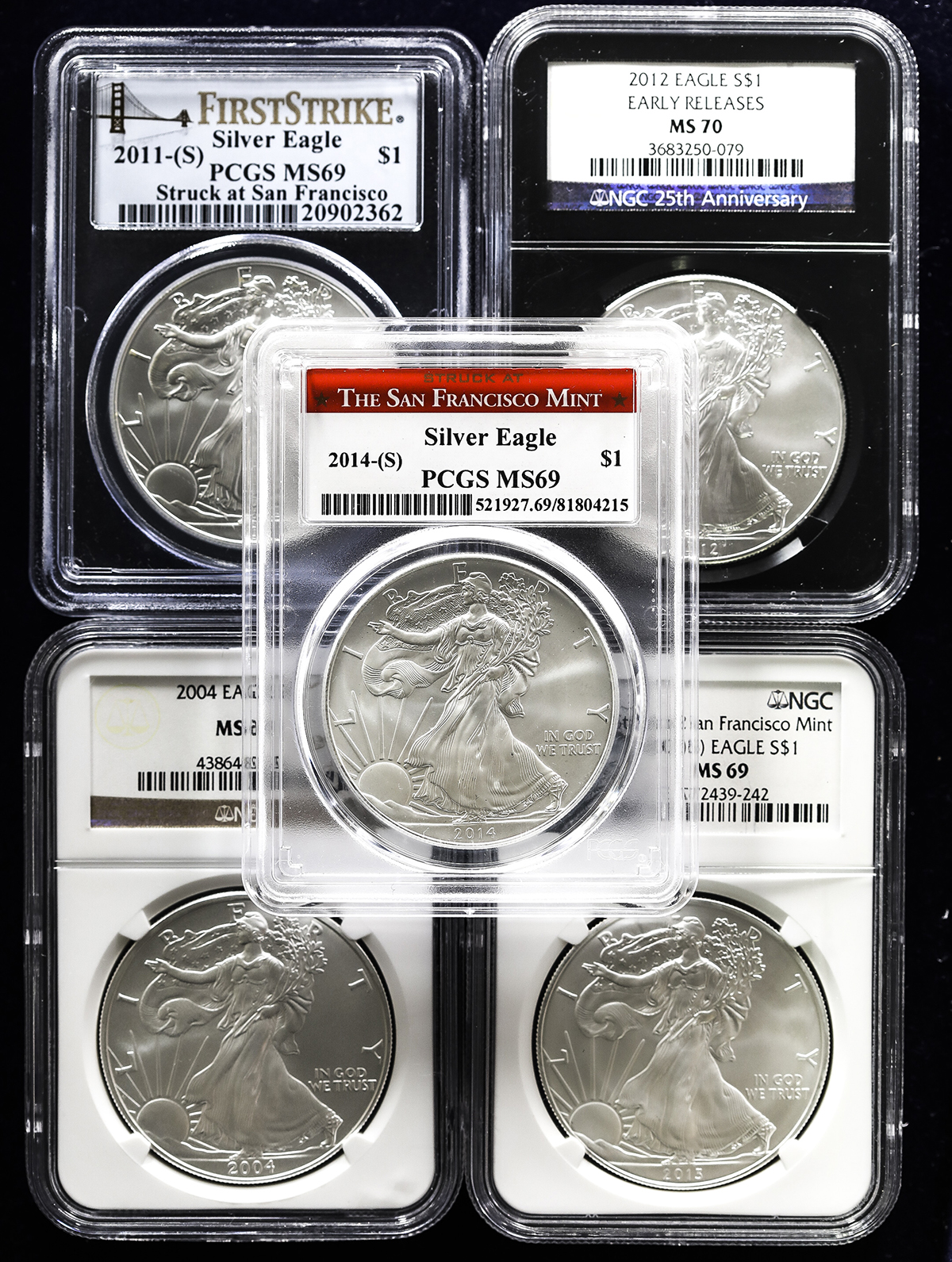 USA アメリカ合众国 Dollar 2004,2011S,2012,2013S,2014S 2004:NGC-MS69; 2011S:PCGS-MS69;2012:NGC-MS70“Early Releases“; 2013S:NGC-MS69;2014S:PCGS-MS69返品不可 要下见 Sold as is No returns UNC。KM-273 Silver Eagle シ儿バーイーグ儿 ,2004:NGC-MS69; 2011S:PCGS- ...