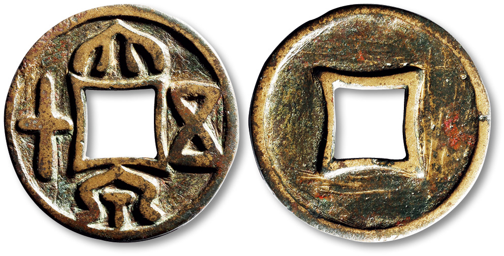 汉代,新王朝。王莽。公元206-220古钱。幺泉一十,背面无字。些许积土,呈现诱人棕绿色。