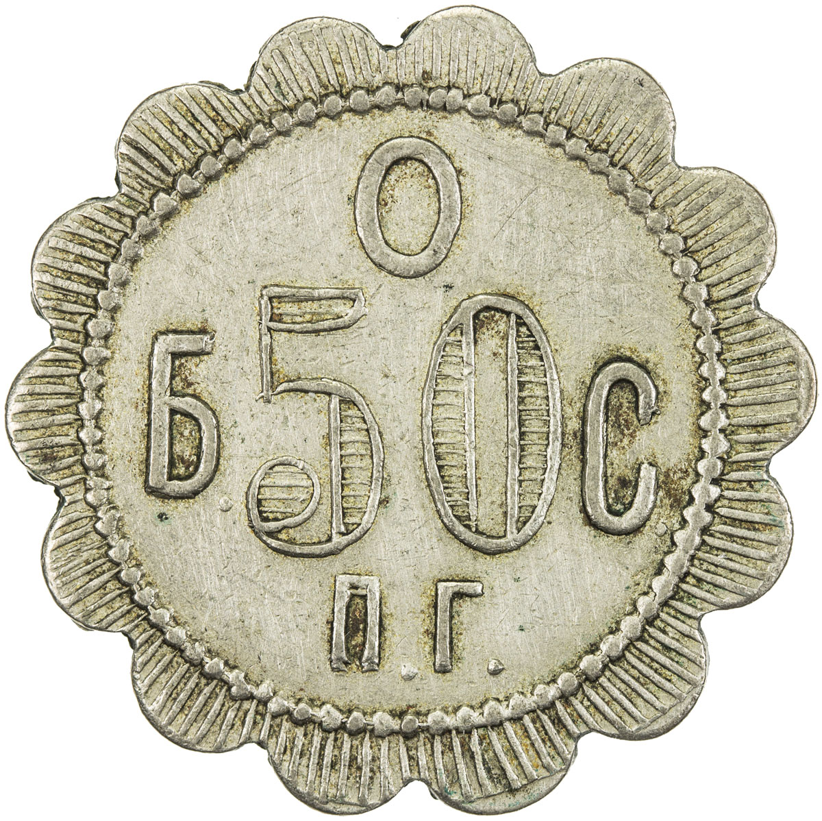 World Coins - Europe,AZERBAIJAN: 50 kopeks token, ND (ca. 1910), 27mm scalloped token of the Baku Public Council, "0 / b50C / n.r." within beaded inner circle with radiating lines on outer scalloped area , large "50" with small "K" at bottom right, all wi ...