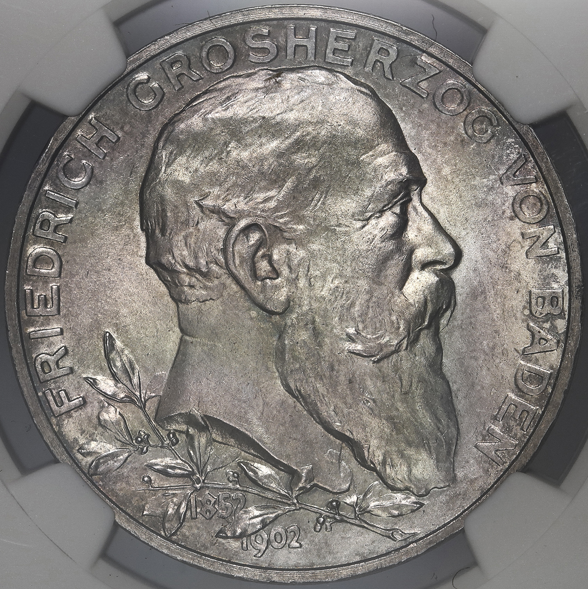 GERMANY Baden バーデン 5Mark 1902G NGC-MS65 トーン UNC/FDC。Dav-534 KM-273 フリードリヒ1世治世50周年 シュツットガ儿ト トーン UNC/FDC