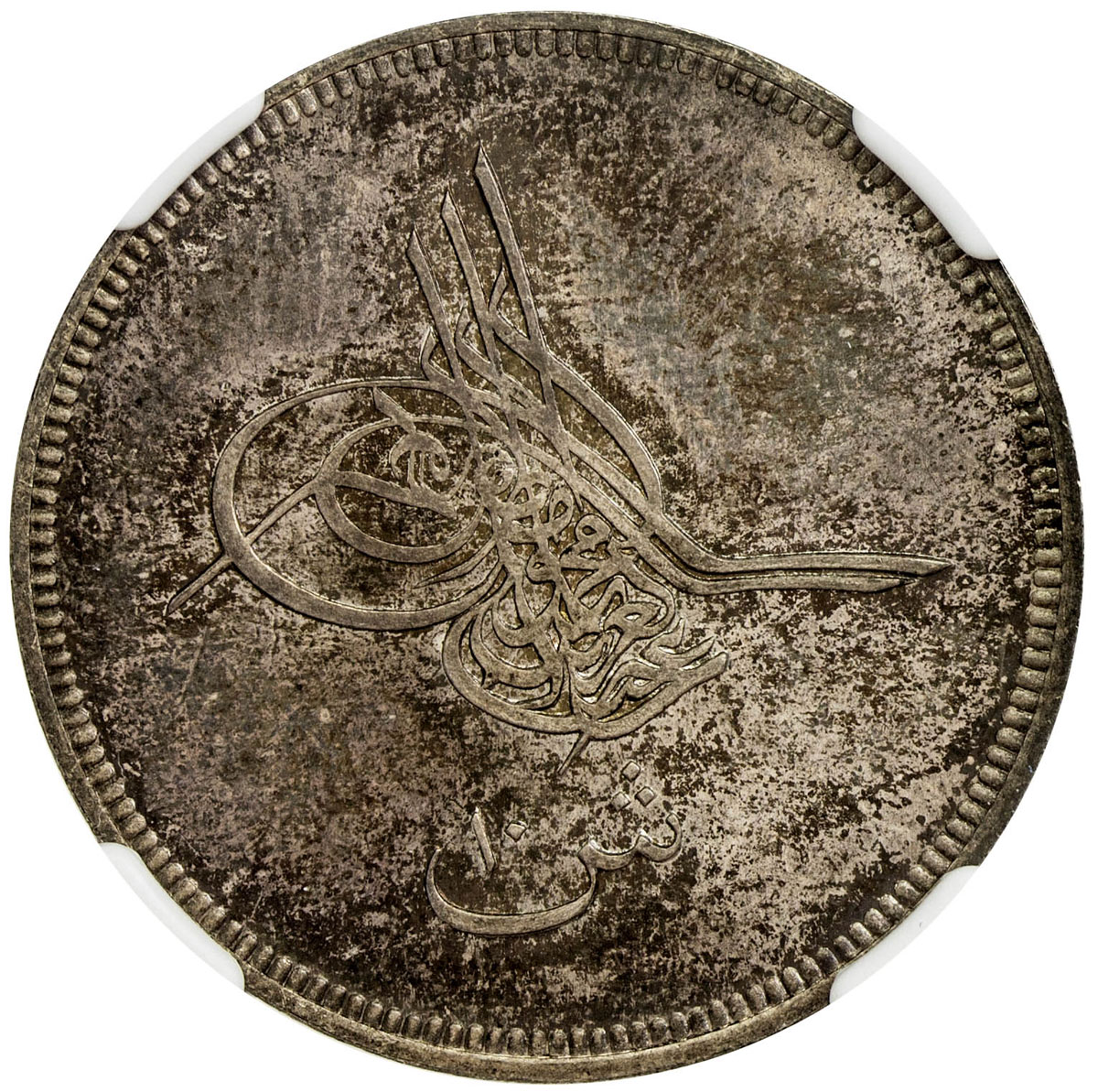 Islamic - Ottoman Empire,EGYPT: Abdul Aziz, 1861-1876, AR 10 qirsh, Misr, AH1277 year 4, KM-257, remarkably well struck up example with deep original toning over brilliant lustrous proof fields, NGC graded Proof 65, RRR. In 1863 the Paris mint struck a ...