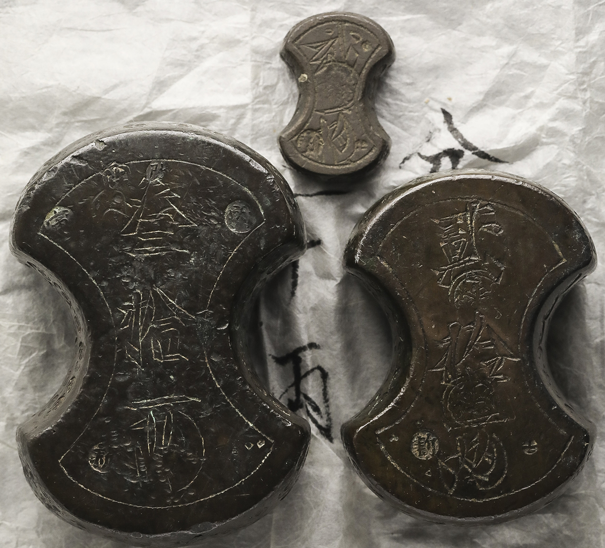 日本 古分铜 三十両(约1100g) 二十両(约260g) 二両(约75g) 计3枚组 3pcs 返品不可 要下见 Sold as is No returns (VF)美品。 (VF)美品