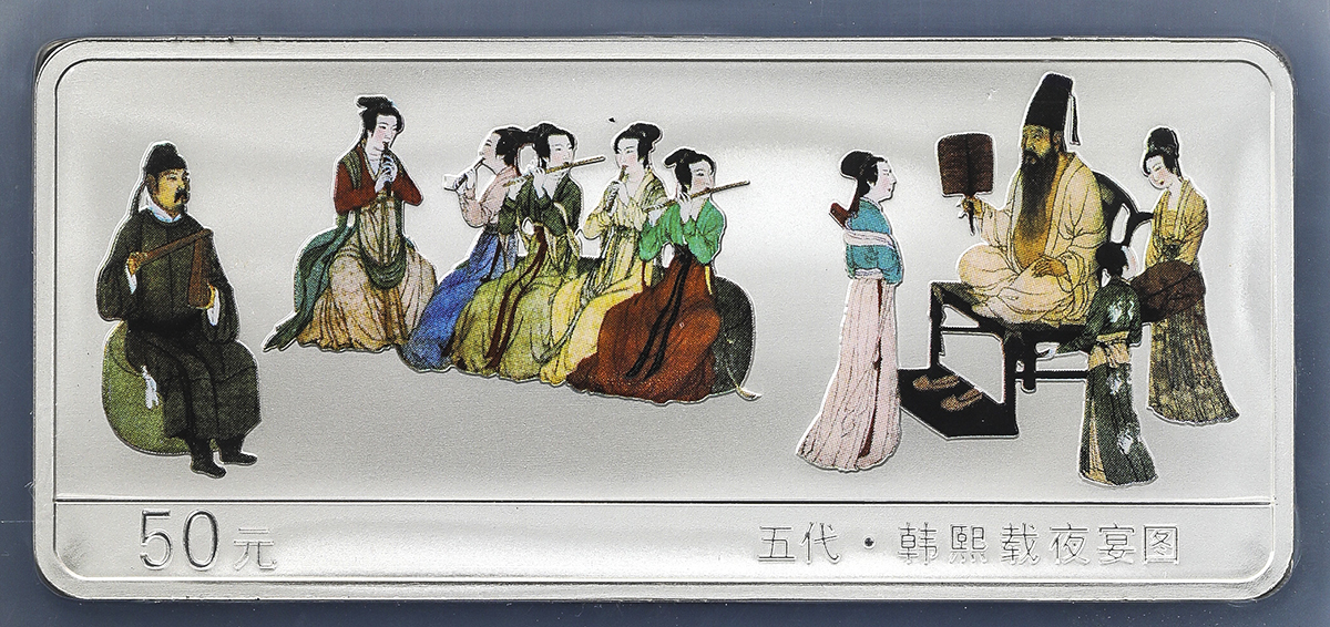 关于2001年中国传统绘画《韩熙载夜宴图》彩色纪念银币一枚,精制,面值50元,重量5盎司,成色99.9%,发行量18800枚,此币融和了国画技艺和现代铸币技术,堪称中国现代金银币史上的艺术珍品,极具观赏及的评论