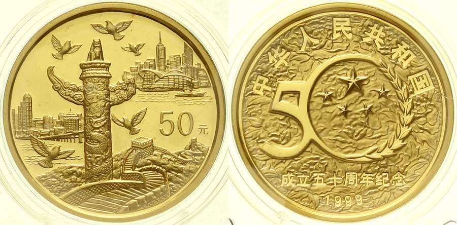 Volksrepublik seit 1949 50 Yuan GOLD 1999. 50. Jahre Volksrepublik China. 3. Ausgabe. Ziersaule und Groe Mauer. 15,55 g. 999er Gold. Originalverschweit mit Zertifikat (mit Bleistift beschriftet) und Umverpackung (mit Aufkleber). Auflage max. 15700 Ex. KM ...