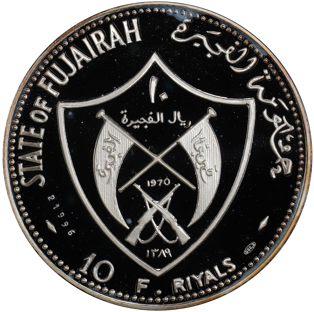 World Coins - Asia & Middle-East,FUJEIRA: Muhammad b. Hamad al-Sharqi, 1952-1974, AR 10 riyals, 1970/AH1389, KM-20, 45mm, Visit of Pope Paul VI to Philippines, mintage of only 300 pieces, PCGS graded PF67 DC, R.
