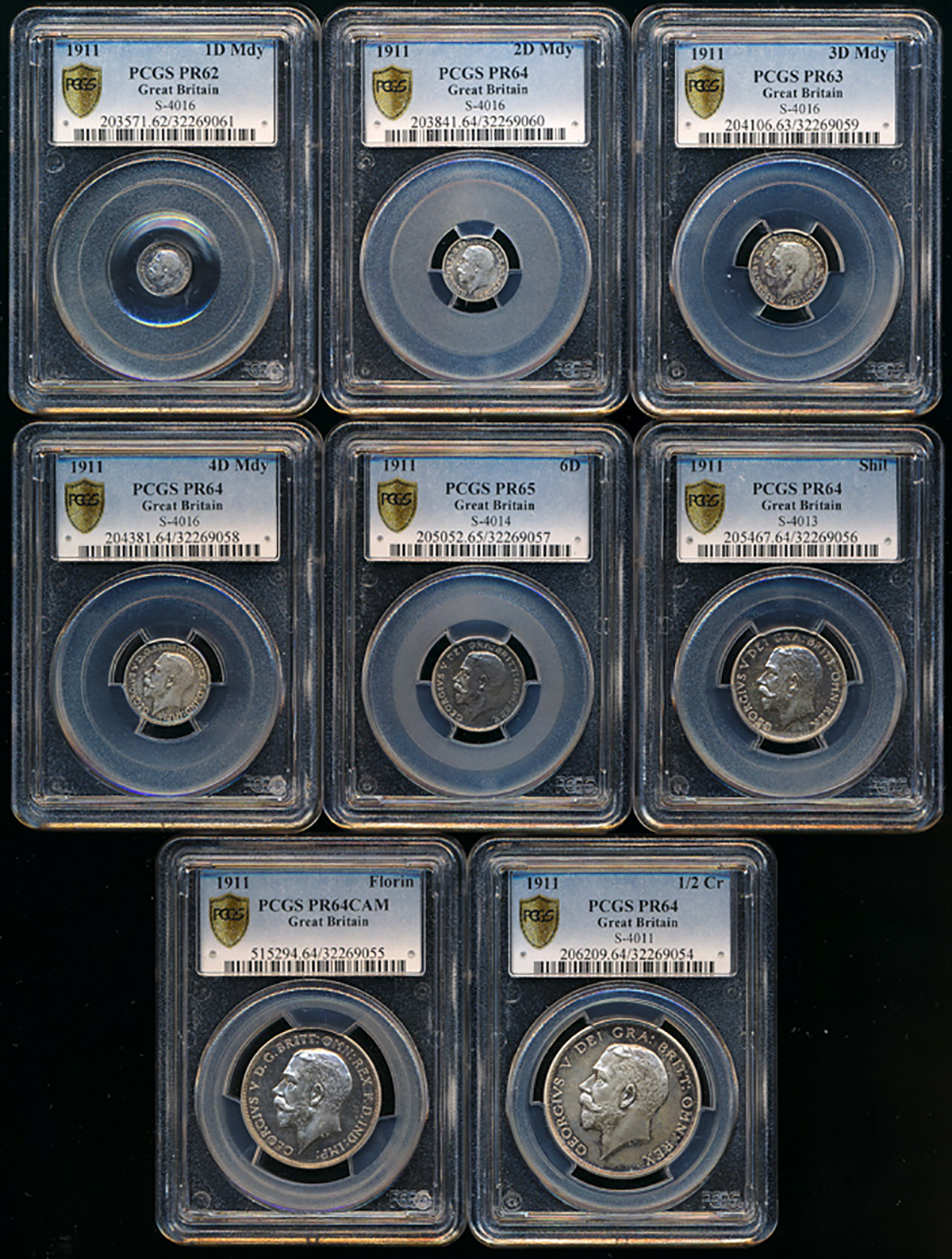 GREAT BRITAIN George V ジョージ5世(1910~36) AR Proof Set 1911 1/2Crown:PCGS-PR64,Florin:PCGS-PR64 CAM,Shilling:PCGS-PR64,6Pence:PCGS-PR65,4Pence:PCGS-PR64,,3Pence:PCGS-PR63,2Pence:PCGS-PR64,Pency:PCGS-PR62, Proof AU~UNC+。S-PS13(S4011~4016) KM-PS19(KM-811 ...