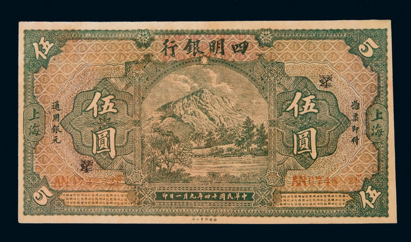 民国十四年旧仿四明银行银元票伍圆一枚,加盖“上海”,九七成新