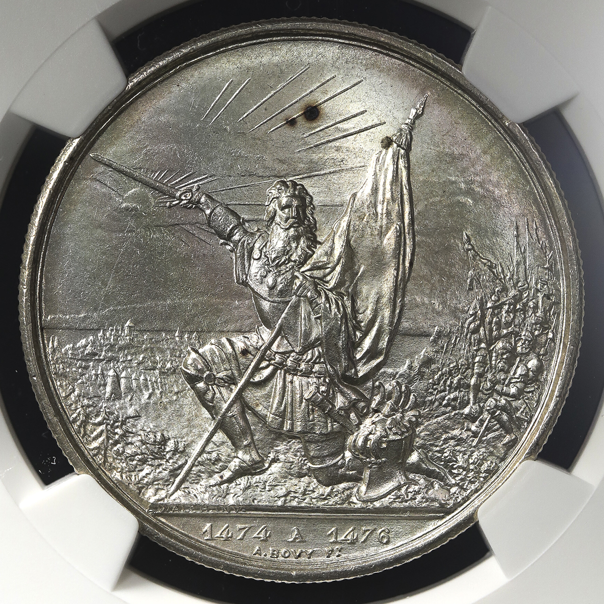 1874 Nevada State Agricultural Mining and Mechanical Society Award Medal. Silver. 41 mm. 25.9 grams. Awarded to Mrs. G.D. Barnett. About Uncirculated.,<strong>Obv:</strong> A collection of agricultural and mechanical items in the foreground, with a miner digging with a pickaxe on a hillside in the middle distance. Beyond is a three-masted sailing ship entering a bay or inlet surrounded by hills, which would have been quite a rare sight for Nevada, even in 1874! <strong>Rev:</strong> Expertly engraved inscription THE / NEVADA STATE / AGRICULTURAL / MINING / AND / MECHANICAL SOCIETY / TO / MRS. G. D. BARNETT / 1874. This piece is a simple silver disc, completely hand engraved on both sides. Since the engravings are incuse the present example is virtually free of wear, but we do note several light surface marks and scuffs that explain our About Uncirculated grade. Handsome satin surfaces are boldly and evenly toned in a deep titanium-gray, enhanced by considerable multicolored iridescence, particularly on the obverse. A very rare medal issued by the Nevada State Agricultural Mining and Mechanical Society for the exhibition held in conjunction with the first Nevada State Fair in Reno, 1874.,,