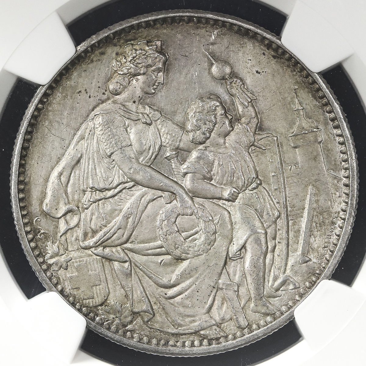 SWITZERLAND Shooting Festival 射击节 5Franks 1865 NGC-MS62 AU/UNC。Dav-382 KM-S8 シャフハウゼン 制造10000枚,NGC-MS62