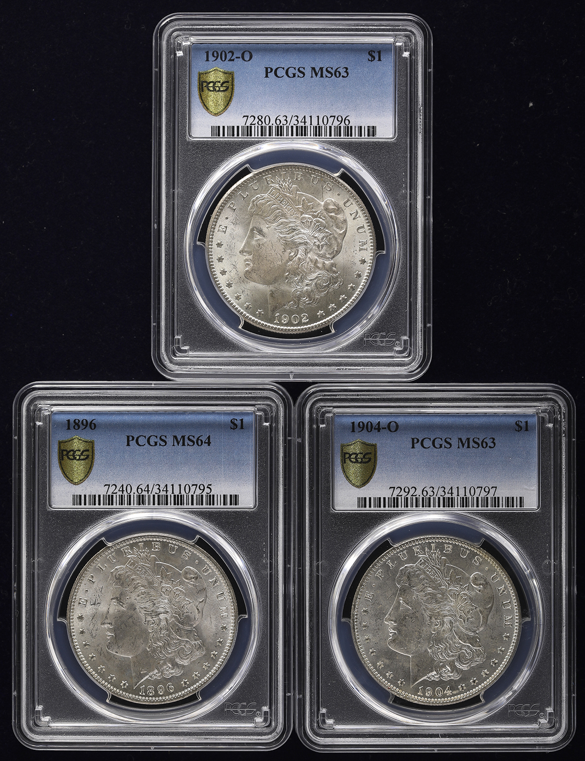 USA アメリカ合众国 Dollar 1896, 1902O, 1904O 计3枚组 3pcs PCGS-MS64,MS63,MS63返品不可 要下见 Sold as is No returns UNC。KM-110 Morgan Dollar フィラデ儿フィア,ニューオリンズ(×2) UNC