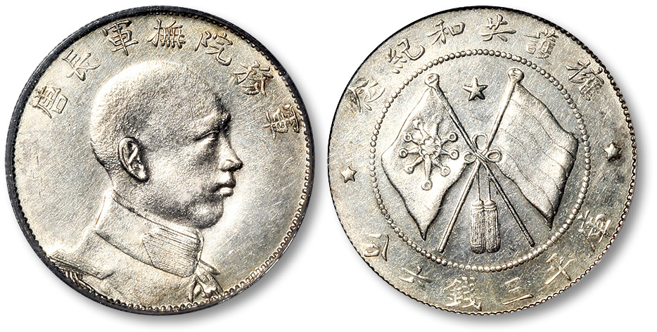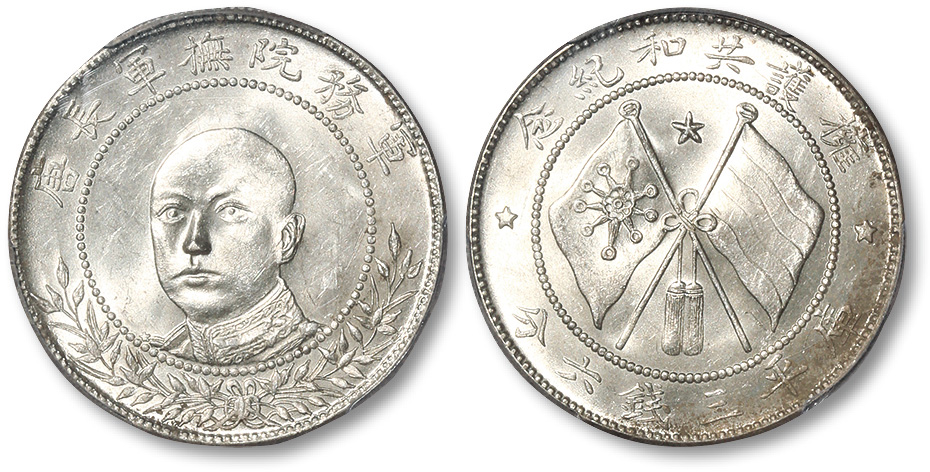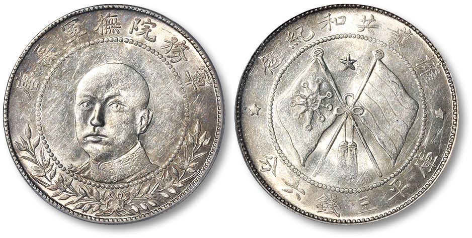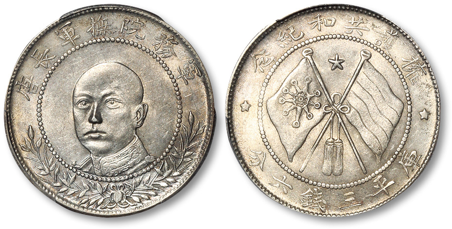 1917年云南省造唐继尧像拥护共和纪念库平三钱六分银币,左面旗帜中心带圈,L&M863,Y479.1,NGC MS65+。查尔斯•谭安藏品。在冠军2016年12月冠军拍卖会上一枚PCGS MS64的钱币卖到了4370美金