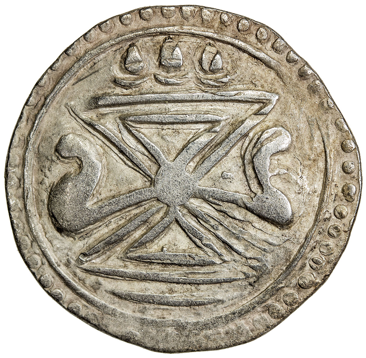 World Coins - Asia & Middle-East,SRIKESTRA: Anonymous, ca. 600-637, AR 96 ratti (10.15g), Mitch-1998:424/5, Mahlo-48, Damaru with only three small ornaments above , sankh shell in srivatsa, the actual location of this subtype has not been determined, Fine ...