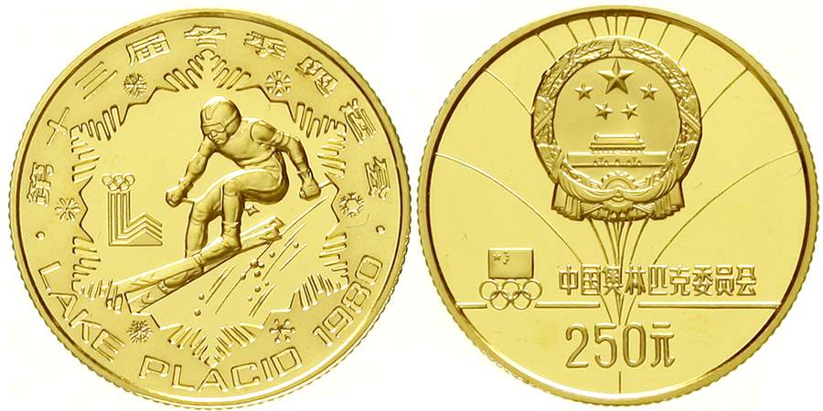 Volksrepublik seit 1949 250 Yuan GOLD 1980 Olympische Winterspiele in Lake Placid. Abfahrtslaufer. 8 g. 916er Gold. KM 28 Schon 31 Polierte Platte, etwas beruhrt