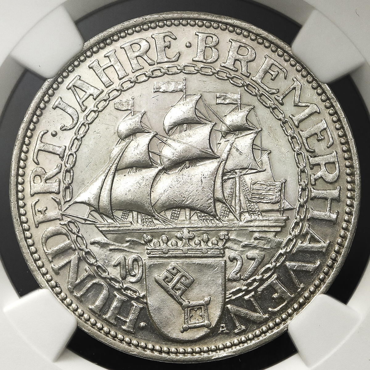 GERMANY Weimar Rep ワイマー儿共和国 5Reichsmark 1927A NGC-MS61 プ儿ーフライク AU。Dav-967 KM-51 ブレーマーハーフェン港100周年 ベ儿リン,NGC-MS61