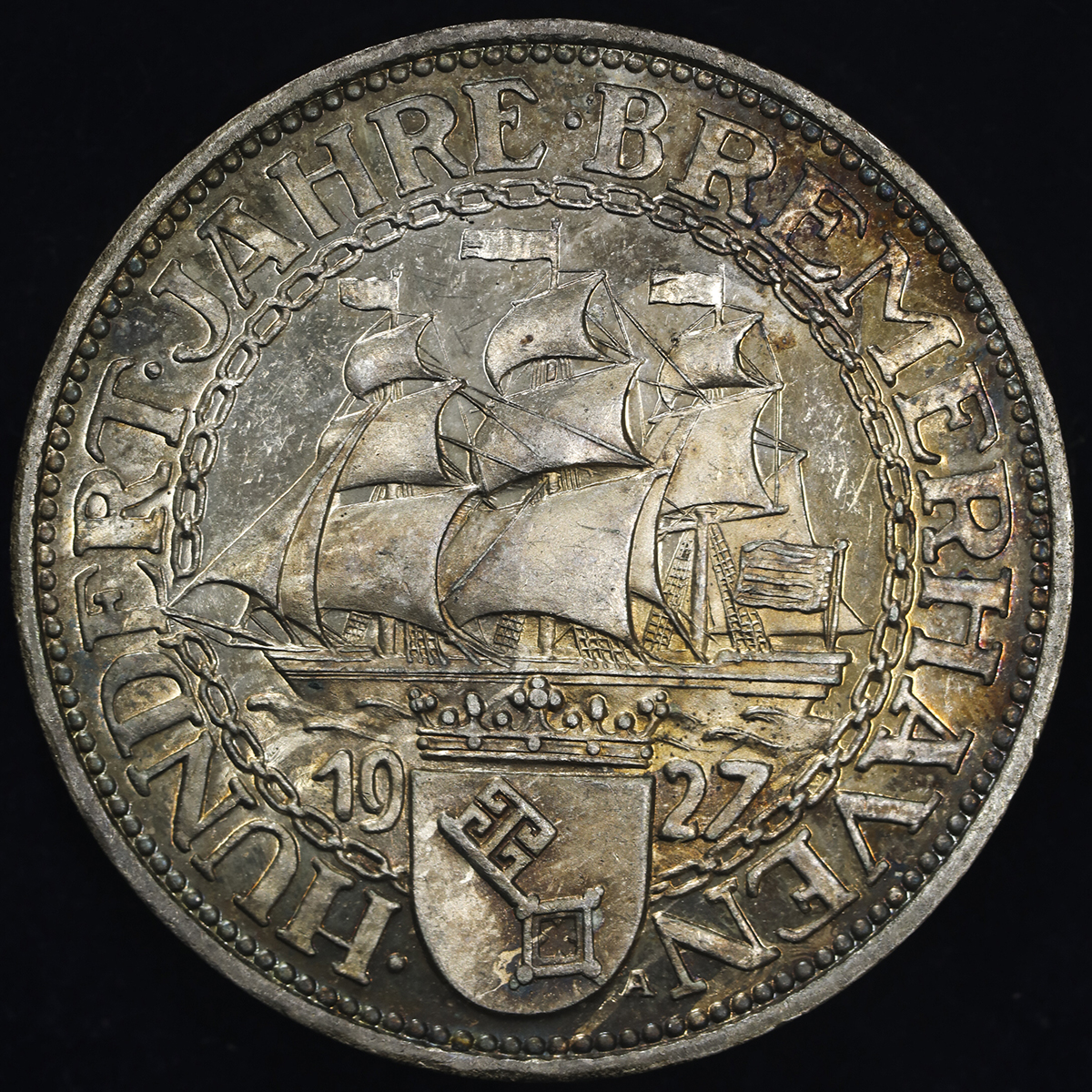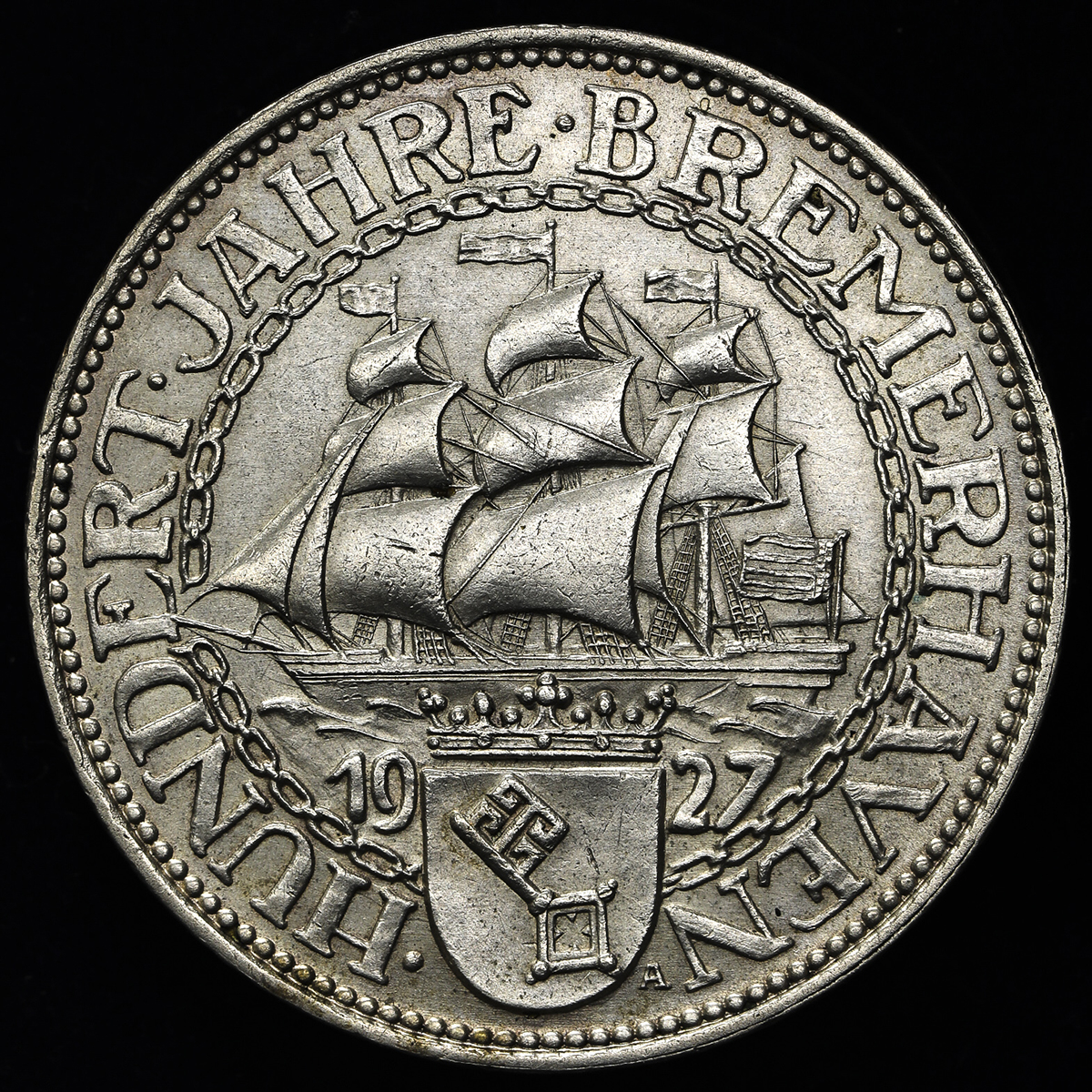 GERMANY Weimar Rep ワイマー儿共和国 5Reichsmark 1927A EF。Dav-967 KM-51 ブレーマーハーフェン港100周年 ベ儿リン