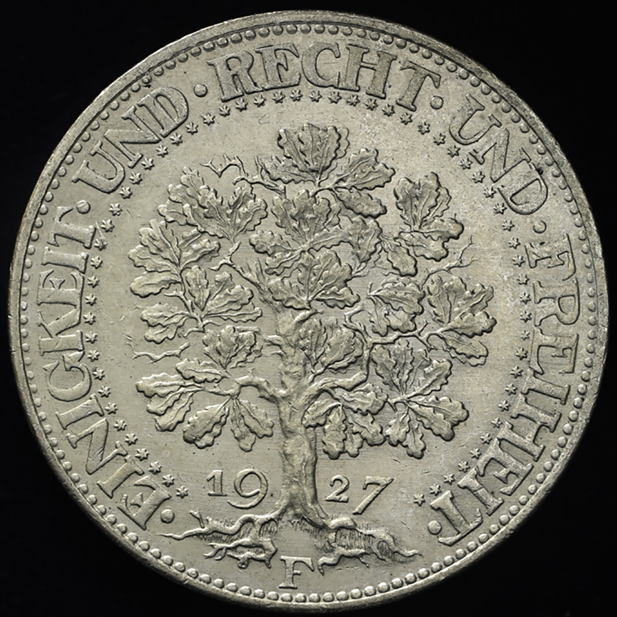 GERMANY Weimar Rep ワイマー儿共和国 5Reichsmark 1927F 洗浄 AU。Dav-966 KM-56 樫の木 シュツットガ儿ト
