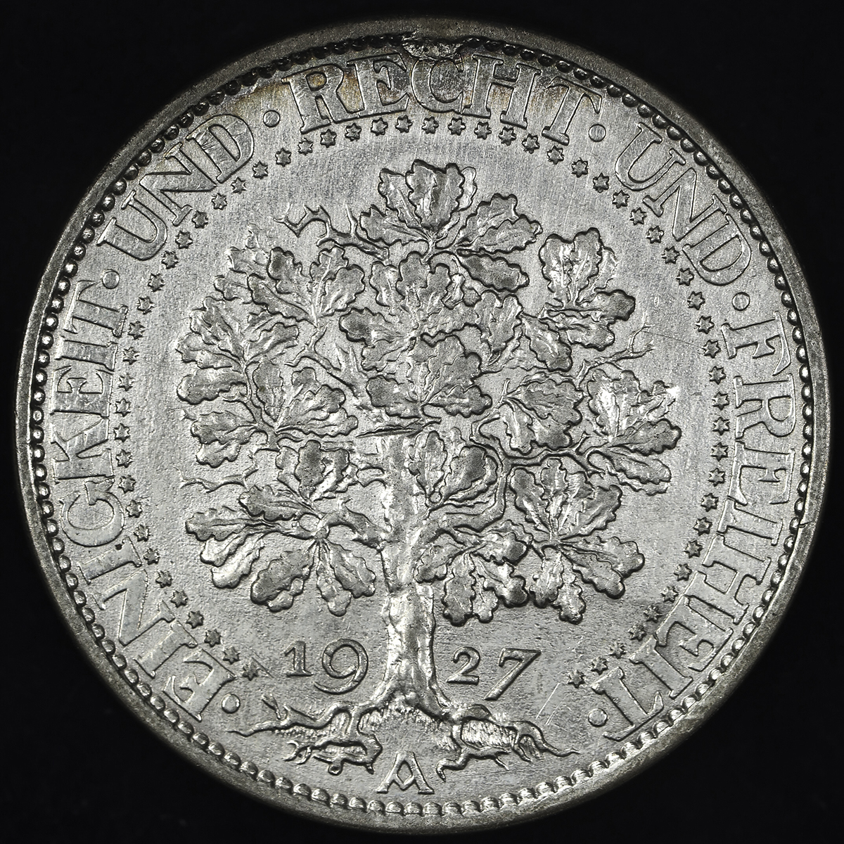 GERMANY Weimar Rep ワイマー儿共和国 5Reichsmark 1927A EF+。Dav-966 KM-56 樫の木 ベ儿リン