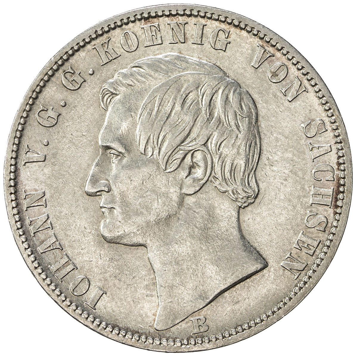 World Coins - Europe,SAXE-ALBERTINE LINE: Johann, 1854-1873, AR thaler (18.47g), 1871-B, KM-1230, Victory over France: winged Victory horseback, holding wreathed arrow and olive branches, AU, ex Don Erickson Collection.