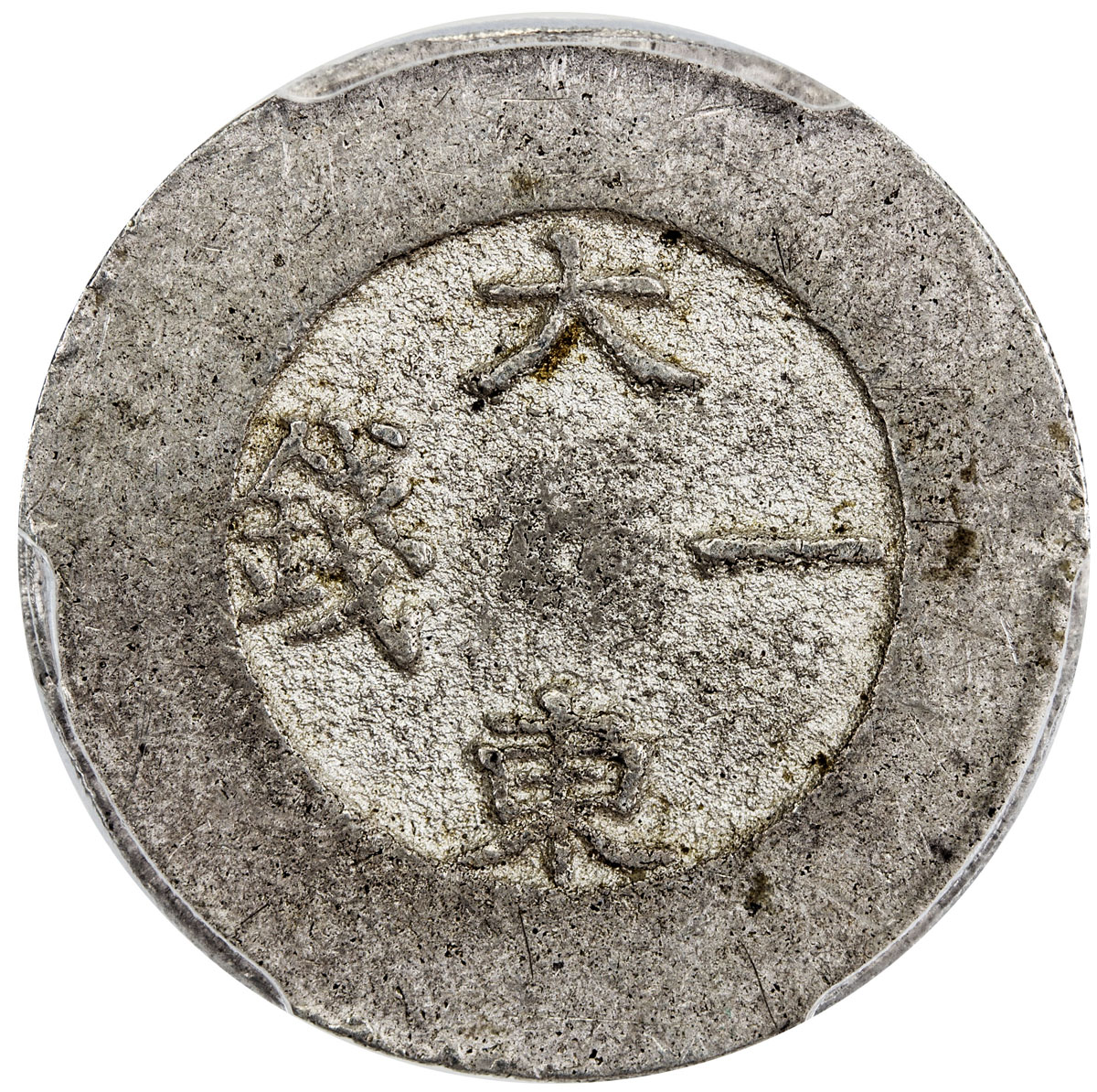 World Coins - Asia & Middle-East,KOREA: Yi Hyong, 1864-1897, AR chon, ND (1882-83), KM-1081, Tae Dong Treasury mint, black cloisonne enameled center circle, with about 10% of the enamel remaining, PCGS graded AU55.
