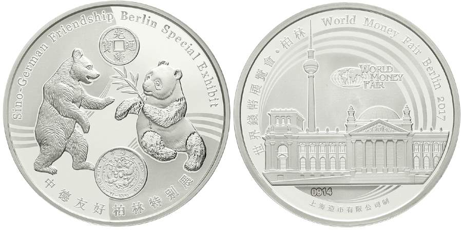 2017年世界钱币展览会·柏林——中德友好特别展银质纪念熊猫,重量16克,成色99.9%,精製镜面,发行量300枚,NGC PF70 ULTRA CAMEO