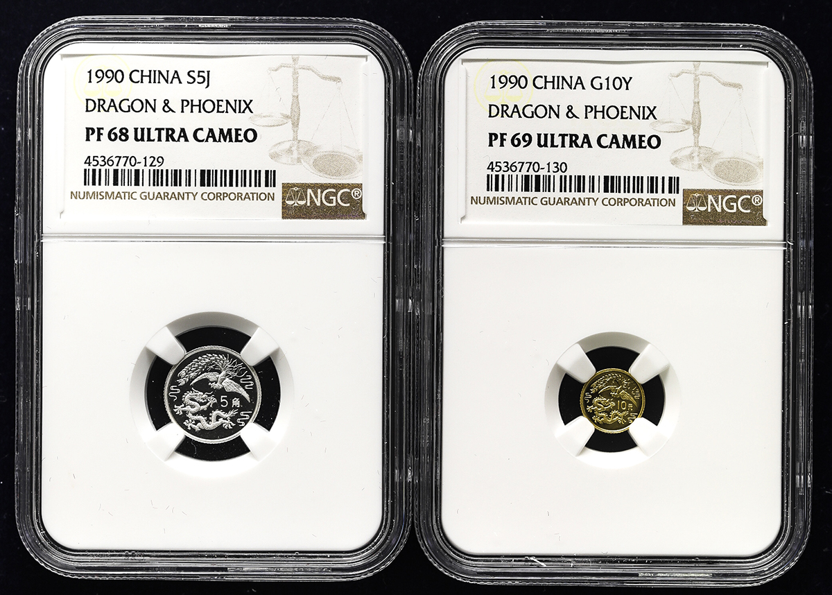 中华人民共和国 People‘s Republic of China Proof Set 1990 NGC-PF68,69 Ultra Cameo オリジナ儿ケース付 with original case Proof。KM-265 10元(Yuan),KM-317 中国龙凤记念币 5角(Jiao) 金货之银货のプ儿ーフ货2点セット,NGC-PF68,69 Ultra Cameo オリジナ儿ケース付 wit ...