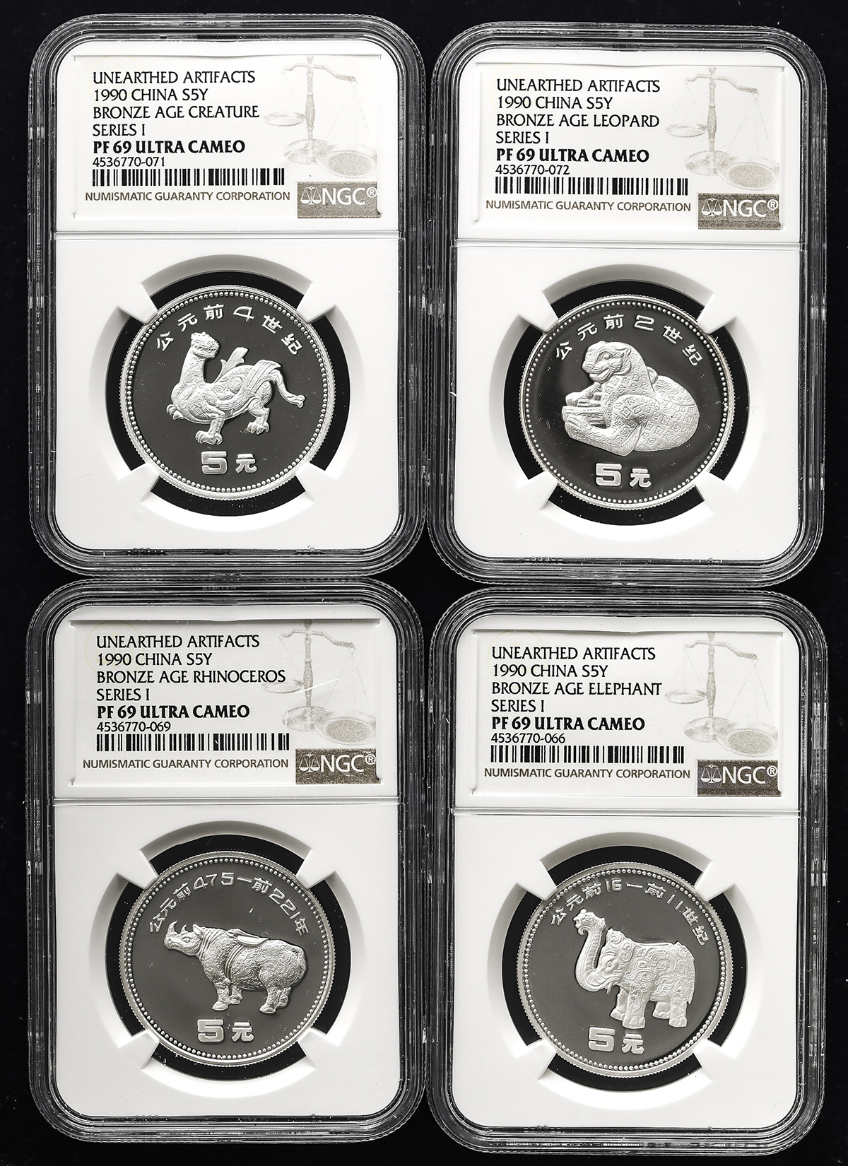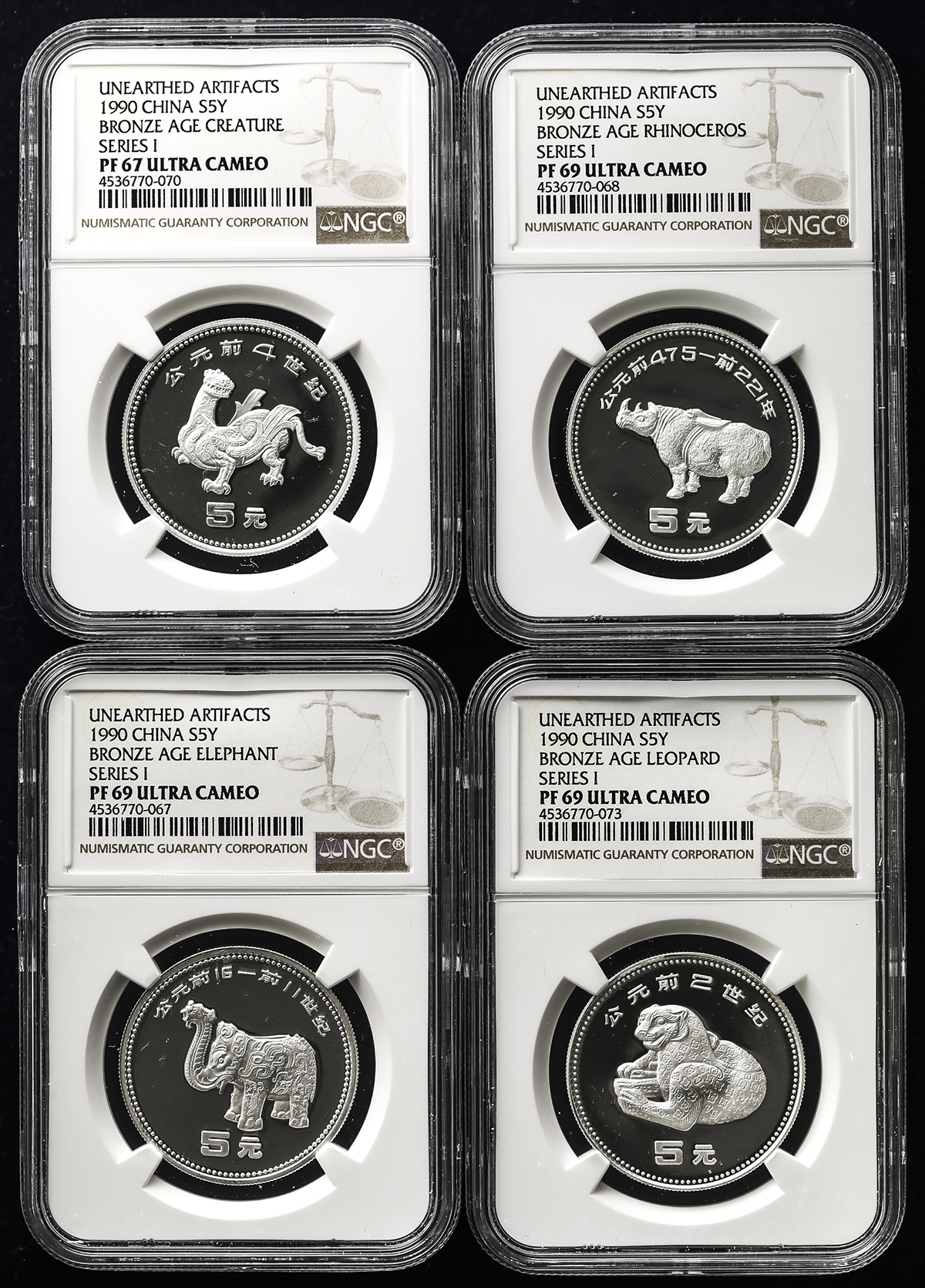 中华人民共和国 People‘s Republic of China Proof Set 1990 NGC-PF67& PF69(×3) Ultra Cameo 保証书付 オリジナ儿ケース付 with original case Proof。KM-42~45 中国出土文物记念币 青铜器精制记念第1组 プ儿ーフ4种セット,NGC-PF67& PF69(×3) Ultra Cameo 保証书付 オリ ...