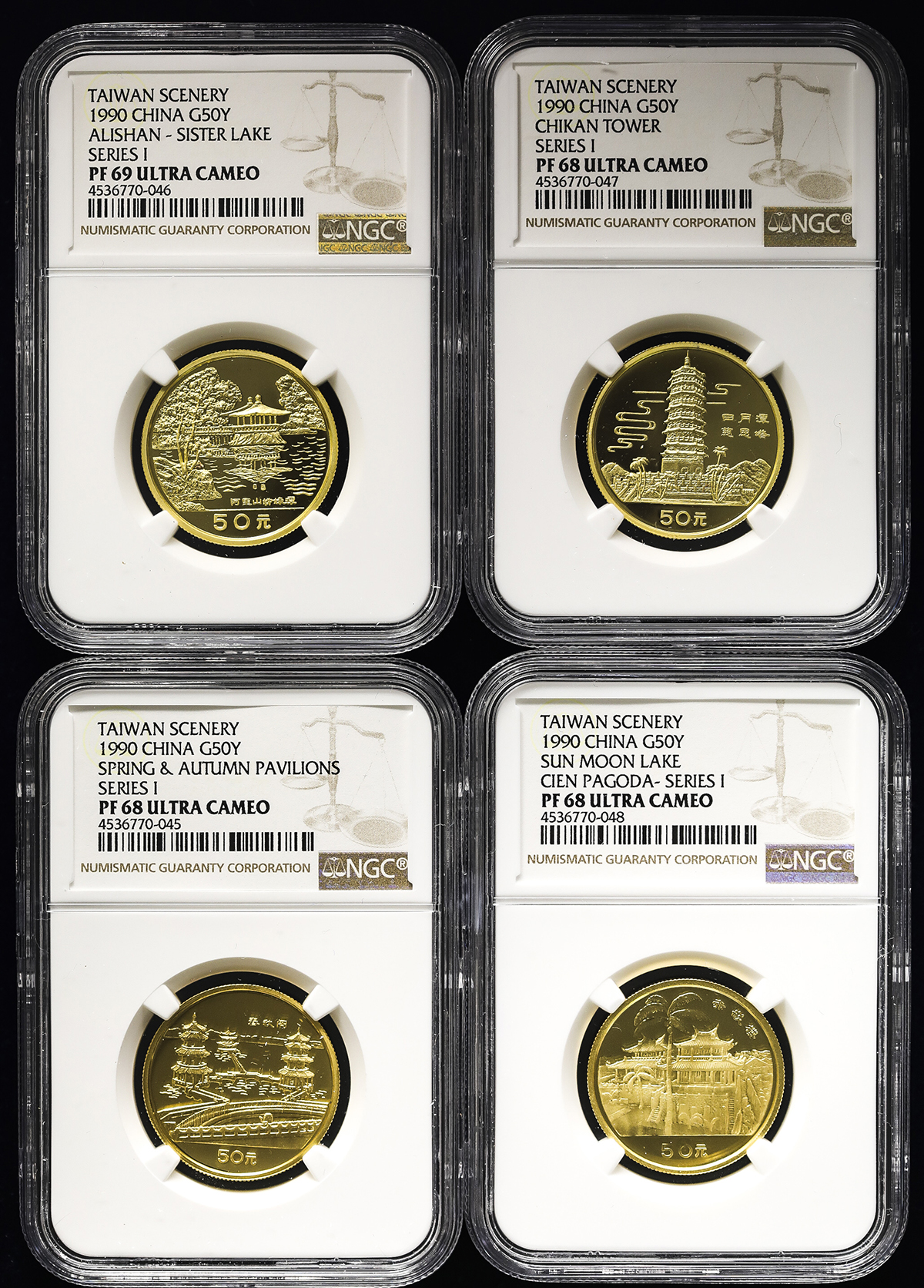 中华人民共和国 People‘s Republic of China Proof Set 1990 NGC-PF68-69 Ultra Cameo 保証书付 オリジナ儿ケース付 with original case Proof。KM-326,327,328,329 台湾风光记念币 高尾春秋閤,阿里山姉妹潭,日月潭慈恩塔,台南赤嵌楼4种セット 制造1000枚,NGC-PF68-69 Ultra ...