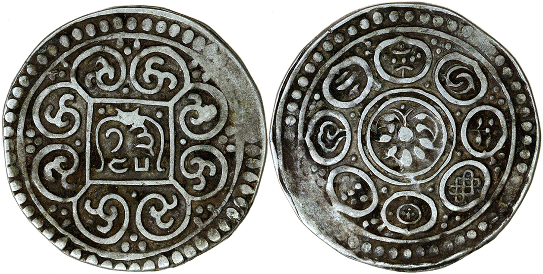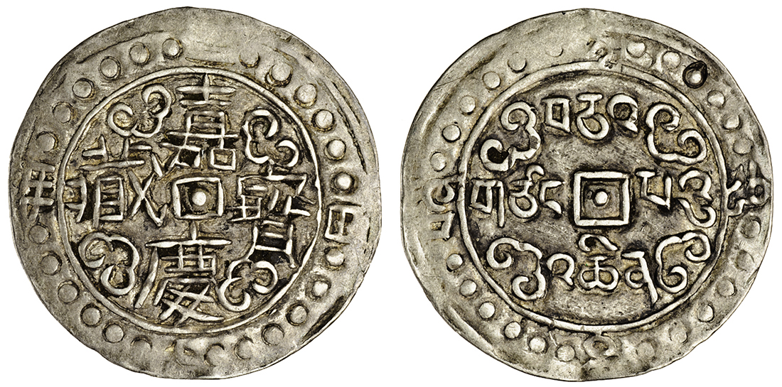 乾隆六十年西藏银币, 约3.77克, 24珠大型版, PCGS VF30. 尼古拉斯‧罗德斯收藏集 - 西藏及尼泊尔钱币纸钞. Tibet, Qian Long (1735-96), 1-Sho, 3.80g, 60th year, large type (26-27mm), 24 beads, divided into two groups of six and one group of 12 beads, rev. 24 beads, divided into four groups of six beads (YZM 105-115 ; KM. C#72.2; LM 640), PCGS VF30