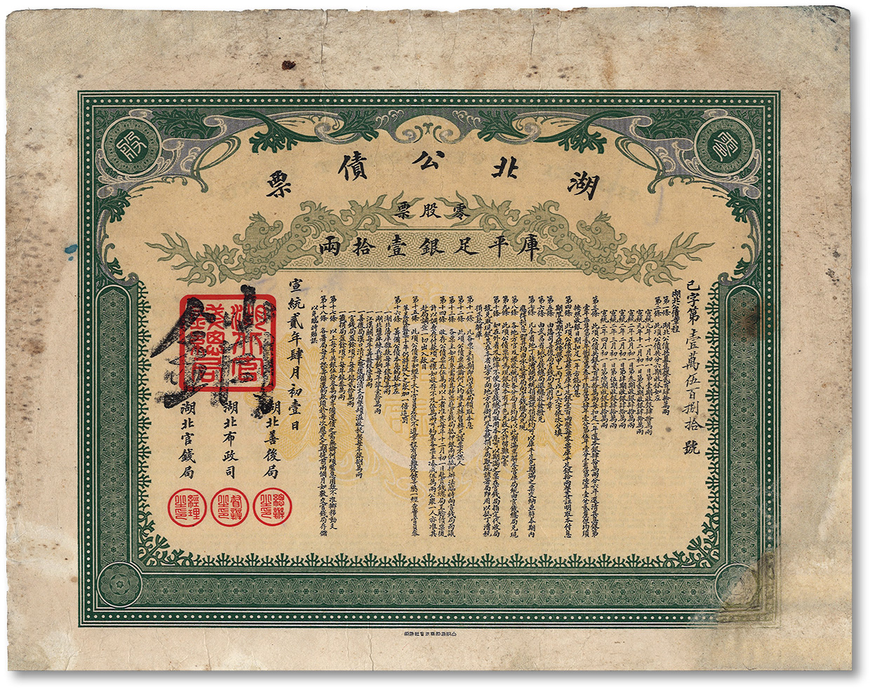 宣统贰年(1910年)湖北公债票,零股票计库平足银壹拾两,少见,有修补,七五成新