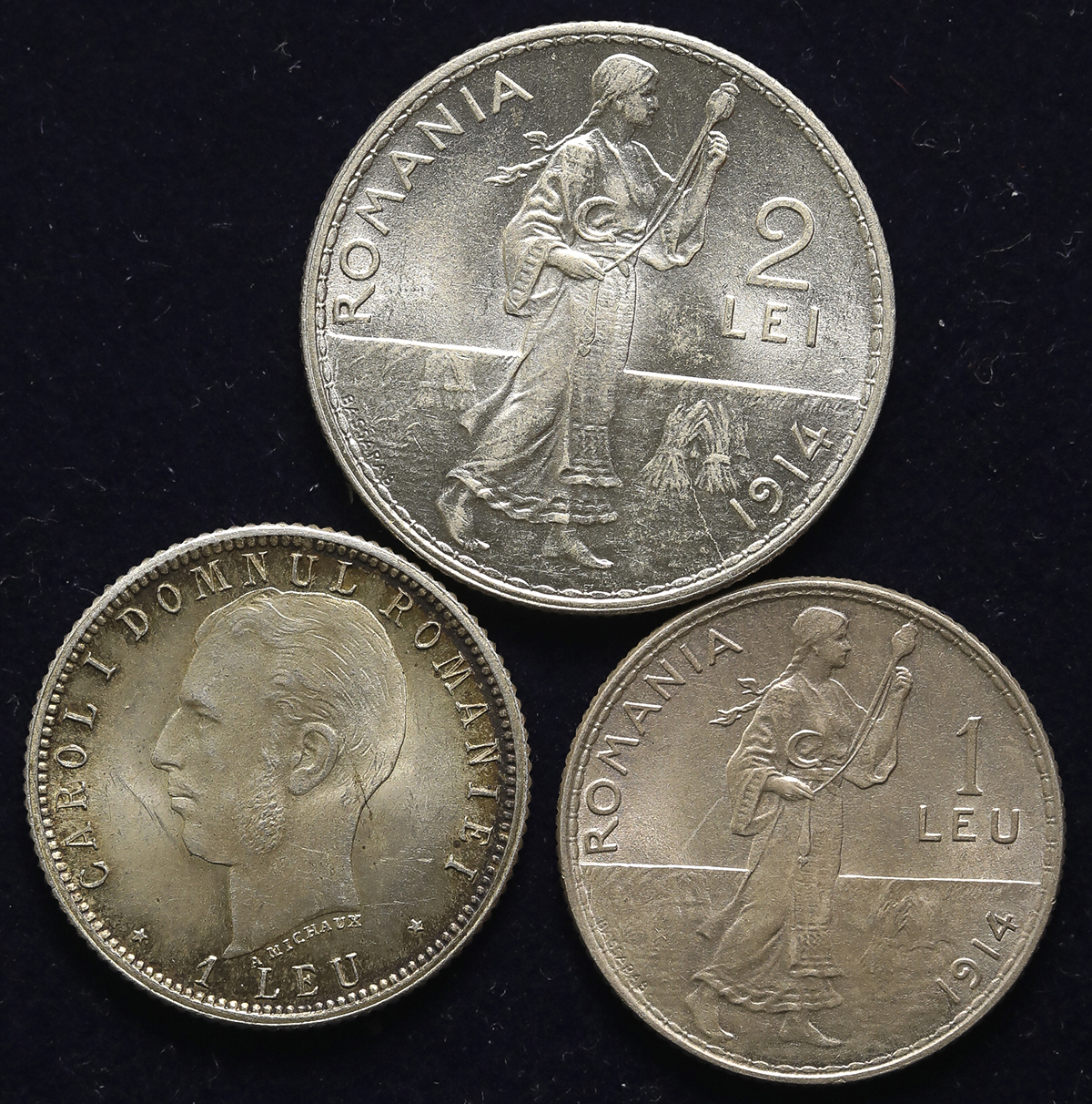 ROMANIA 儿ーマニア Leu 1906,14/2Lei 1914 返品不可 要下见 Sold as is No returns UNC。KM-34,42,43 カロ儿1世(治世40周年记念货含む),返品不可 要下见 Sold as is No returns