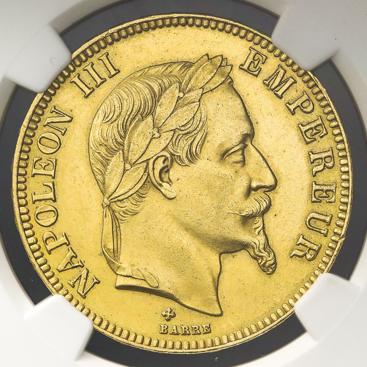 FRANCE Napoleon III ナポレオン3世(1852~70) 100Francs 1868A NGC-MS62 AU/UNC。Fr-580 Gad-1136 KM-802.1 月桂冠 パリ 制造2315枚 Ⓡ,NGC-MS62