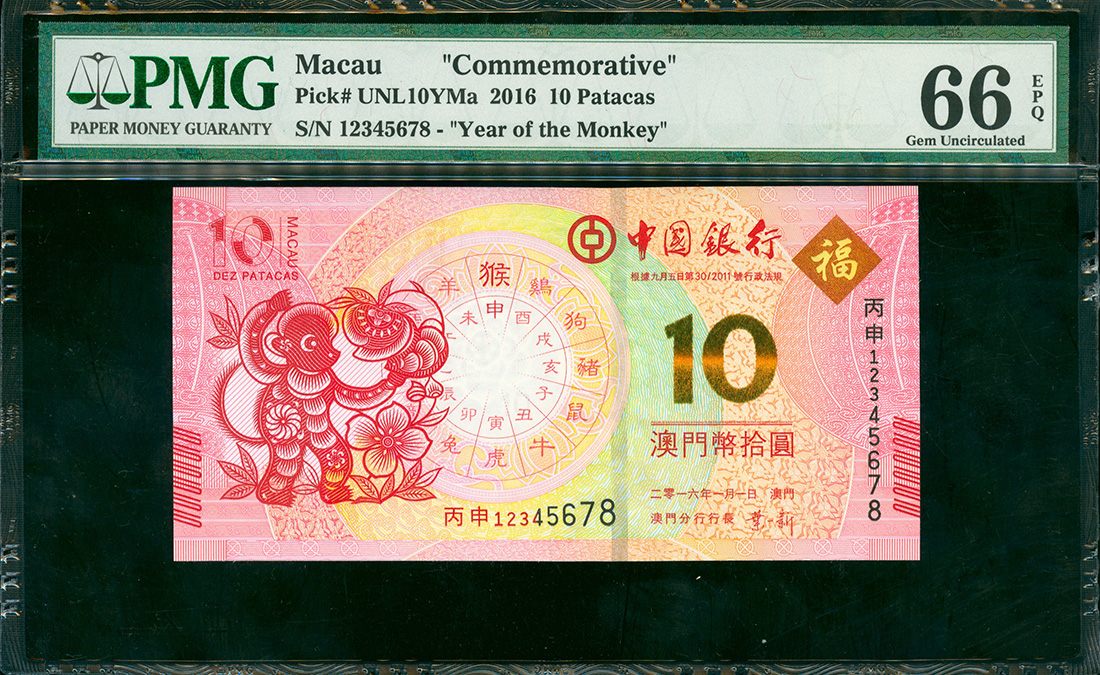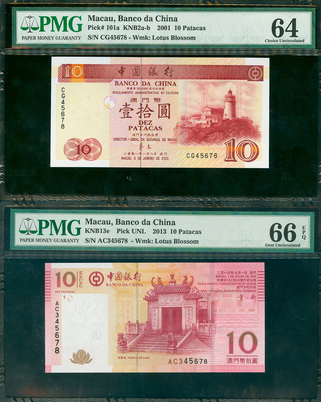 澳门中国银行10元2枚一组,2001及2013年,顺号CG45678及AC345678, 分别评PMG64及66EPQ. 澳门纸币. Macau, Banco da China a pair of 10 patacas, 8.1.2001 and 1.7.2013, ascending ladder number CG45678 and AC345678 respectively,(Pick 101a & KNB13e), PMG 64 Choice Unc ...