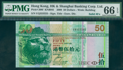 关于2009年汇丰银行50元,幸运号EQ333333, PMG66EPQ的评论