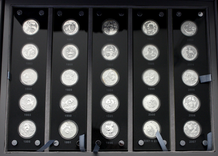 Volksrepublik seit 1949 25 Jahre Panda Silbermunzenset. 25 X 3 Yuan 2007. Mit Motiven aller verausgabten Silberpandas ab 1982, je 1/4 oz. 999er Silber mit Zertifikat in Luxusholzschatulle mit Umverpackung (Umverpackung beschadigt, an 2 Seiten eingerissen). ...