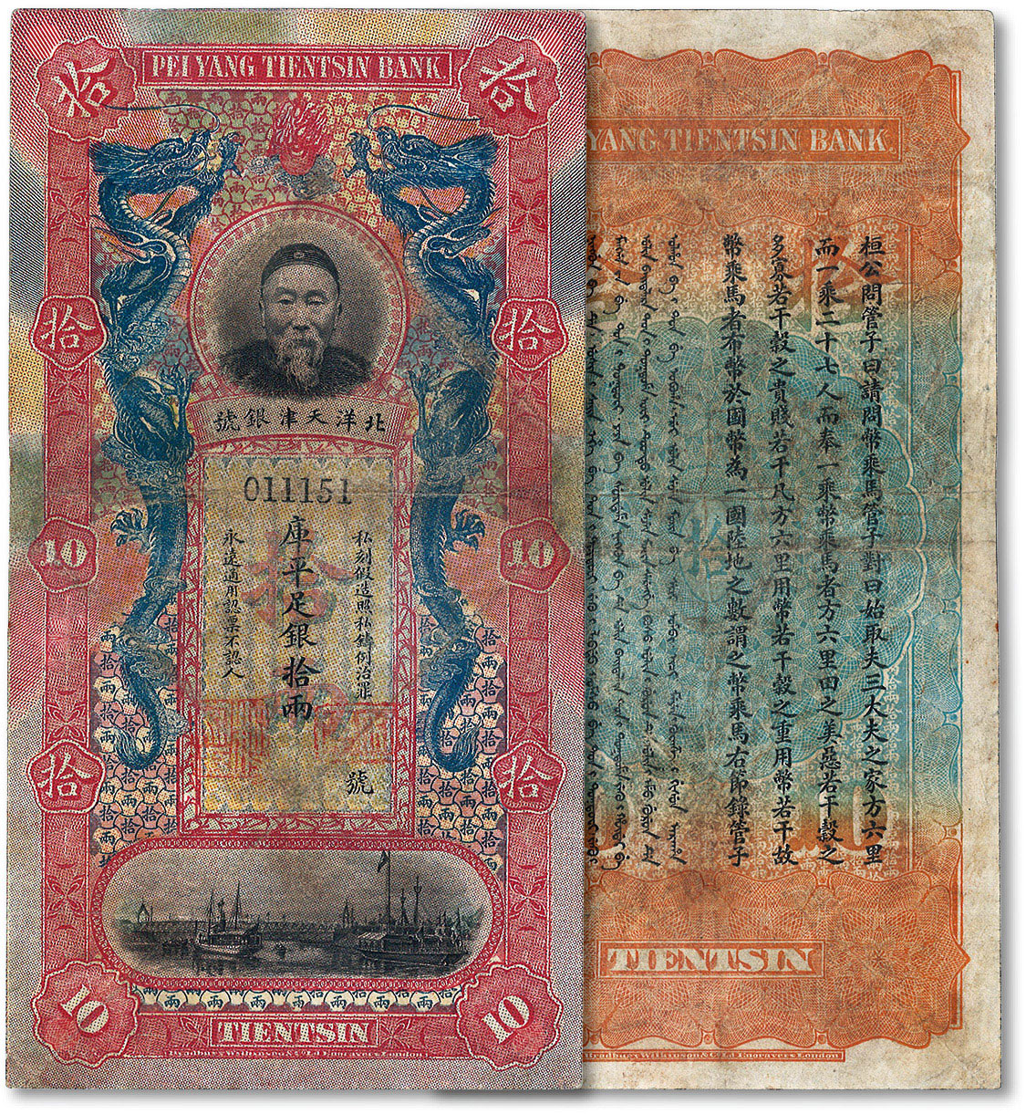 北洋天津银号库平足银拾两,上印李鸿章头像,七五成新