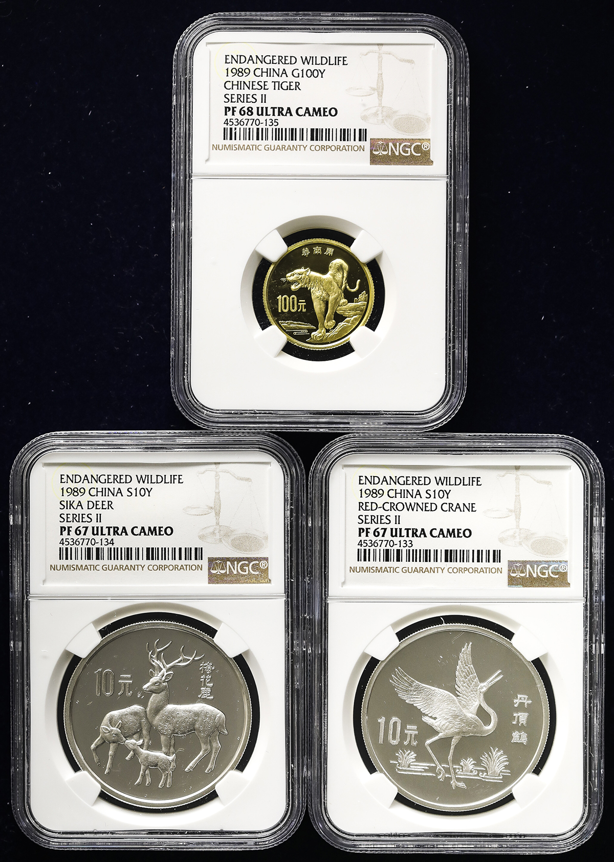 中华人民共和国 People‘s Republic of China Proof Set 1989 NGC-PF67(×2),68 Ultra Cameo 保証书付 オリジナ儿ケース付 with original case Proof。KM-253,254,255 珍奇动物记念币 丹顶鹤,梅花鹿,华南虎 银货2种之金货1种の3点セット,NGC-PF67(×2),68 Ultra Cameo 保証 ...