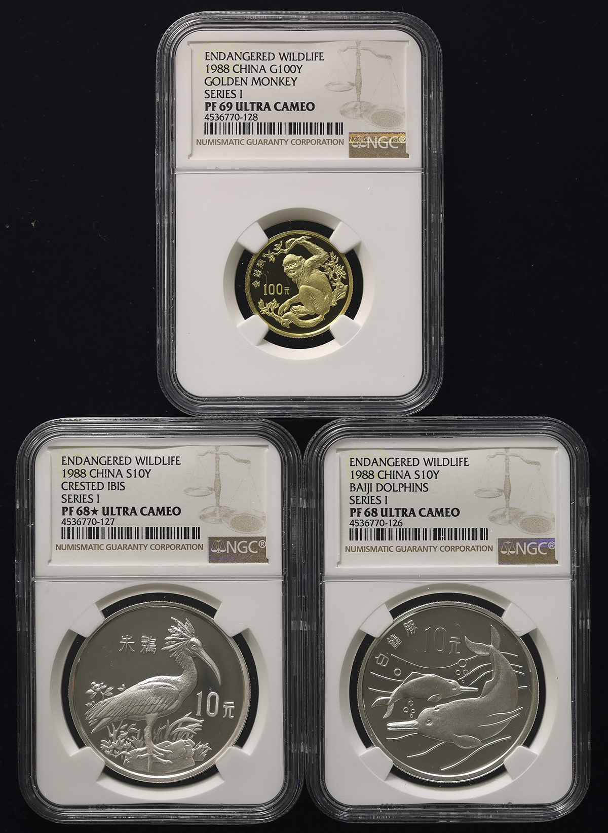 中华人民共和国 People‘s Republic of China Proof Set 1988 NGC-PF68,69 Ultra Cameo 保証书付 オリジナ儿ケース付 with original case Proof。KM-212,213,214 珍奇动物记念币 朱鹭, 金纟猿, 扬子江イ儿カ 银货2种之金货1种の3点セット,NGC-PF68,69 Ultra Cameo 保証书付 ...