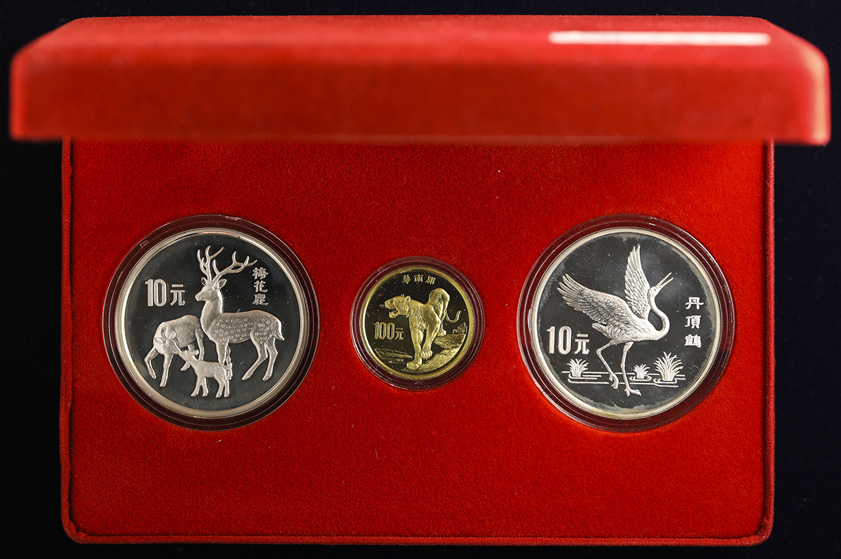 中华人民共和国 People‘s Republic of China Proof Set 1989 保証书付 オリジナ儿ケース付 with original case Proof。KM-253,254,255 珍奇动物记念币 丹顶鹤,梅花鹿,华南虎 银货2种之金货1种の3种セット,保証书付 オリジナ儿ケース付 with original case ...