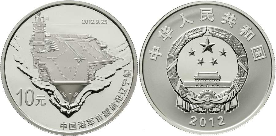 Volksrepublik seit 1949 10 Yuan Silber 2012. Flugzeugtrager Liaoning. 1 Unze. In Originalschatulle mit Zertifikat und Umverpackung. KM - Schon 1885 Polierte Platte