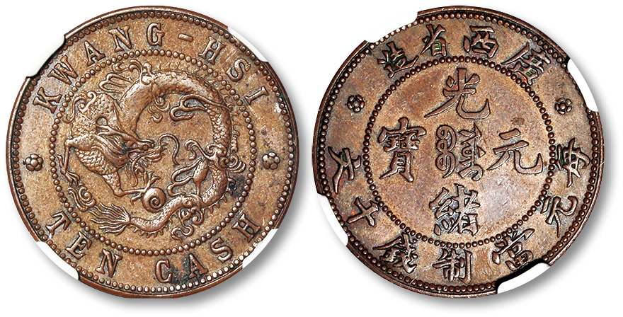 清广西省造光绪元宝每元当制钱十文试铸样币一枚,打制清晰精美,巧克力原色包浆,状态极佳,中国铜圆名誉品,极少见,NGC AU55BN