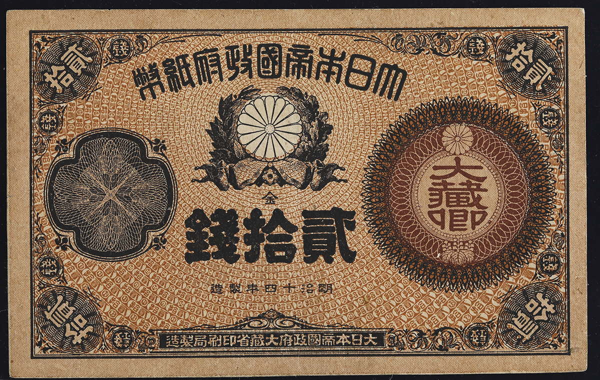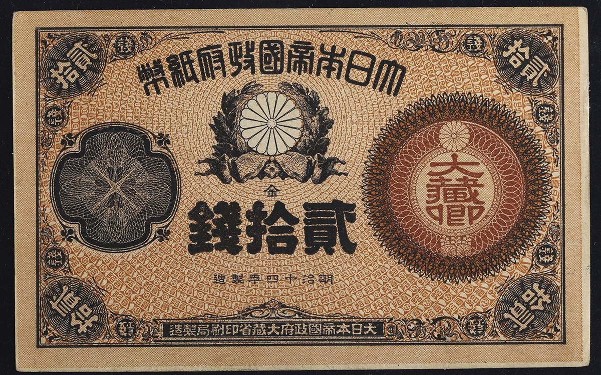 日本 大藏卿20銭札 Revised 20Sen 明治15年(1882)~ (EF)极美品。JNDA11-21 P-15 组番号”第叁〇号”稀少な状态 Ⓡ (EF)极美品