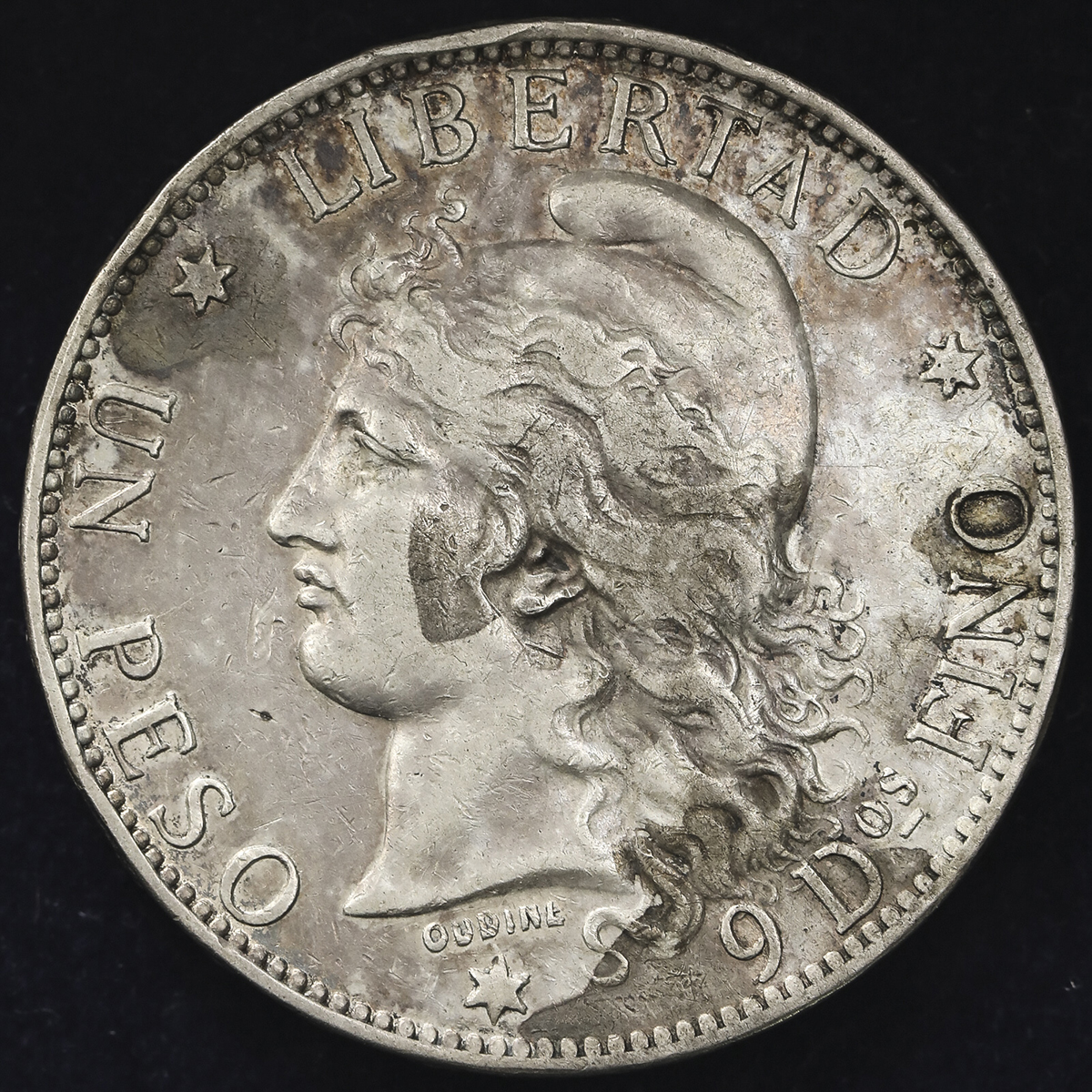 ARGENTINE ア儿ゼンチン Peso 1882 縁 アタリVF。KM-29 左向きリバティヘッド