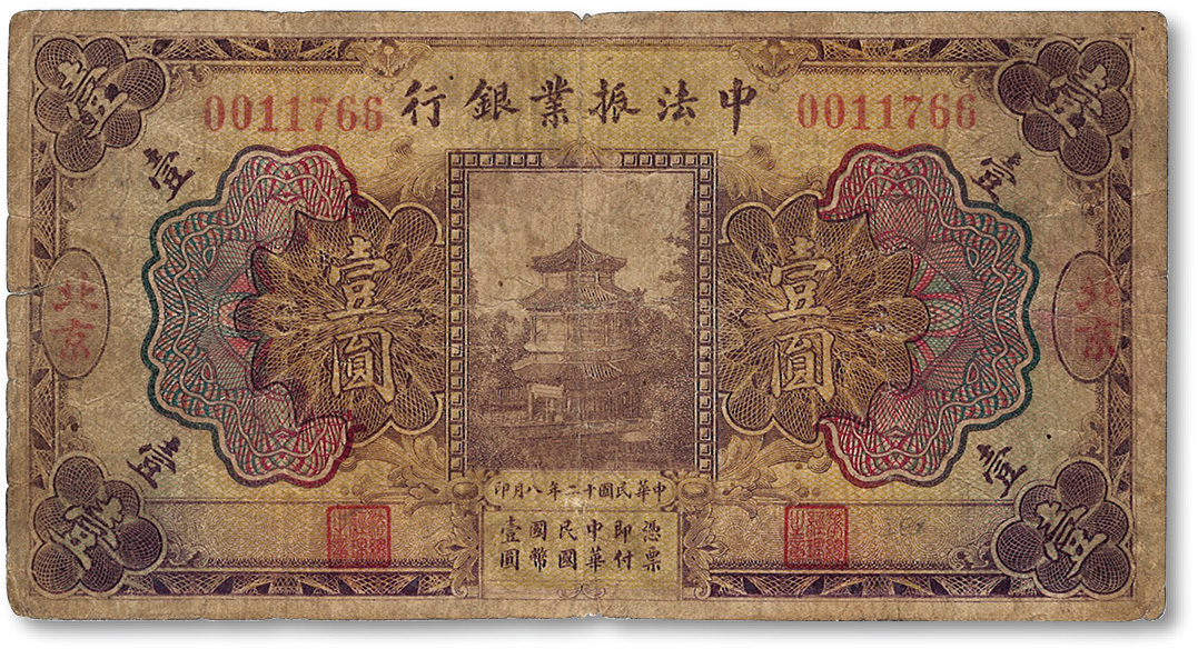 民国二十八年(1939年)中法振业银行壹圆,北京地名,六成新