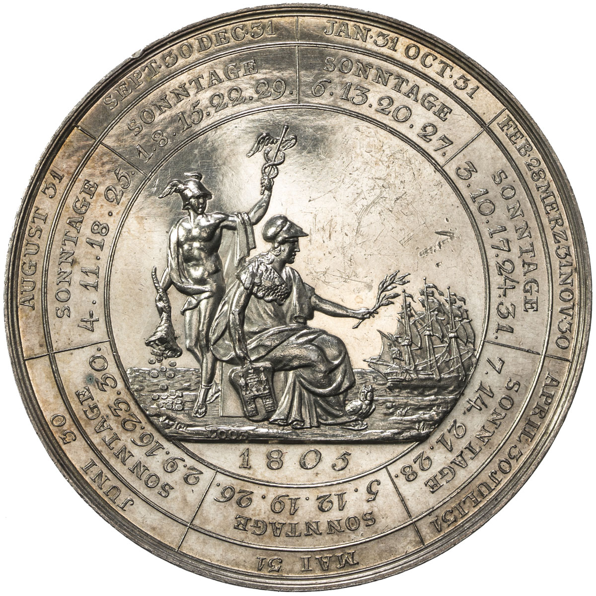 World Coins - Europe,HAMBURG: AR medal (18.88g), 1805, Gaedechens-2010, Sommer-A 121, Strothotte-1805-3, 44mm, silver Calendar medal by D. F. or F. W. Loos, the personified Wisdom sits right holding the Hamburg coat of arms in one arm and in the other a b ...