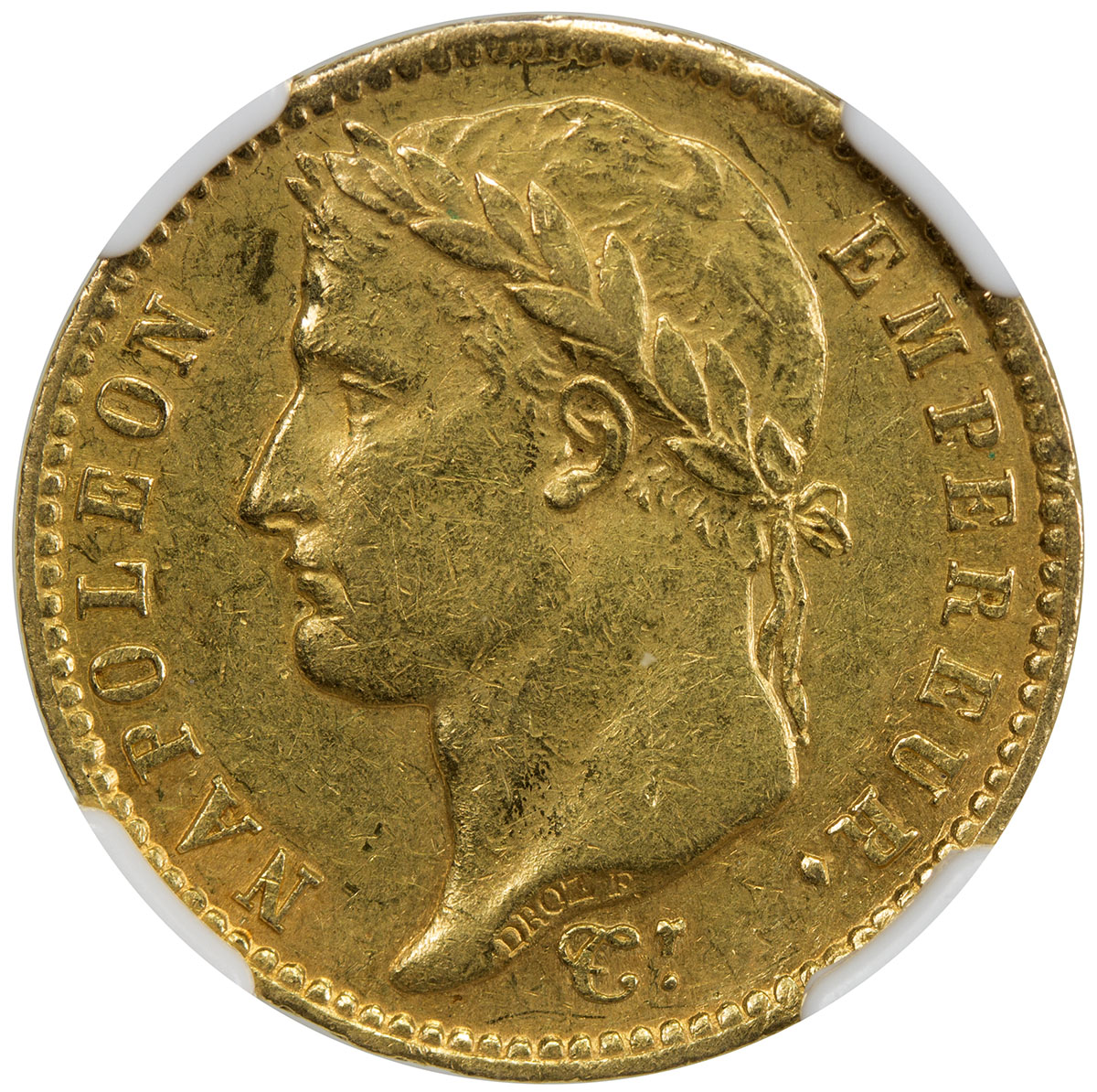 World Coins - Europe,FRANCE: Napoleon I, Emperor, 1804-1814, AV 20 francs, 1812-R, KM-695.8, Gad-1025, Rome mint with privy marks, the She-Wolf with Romulus and Remus and a crowned R, NGC graded AU53. Rome was a department of the First French Empire in ...