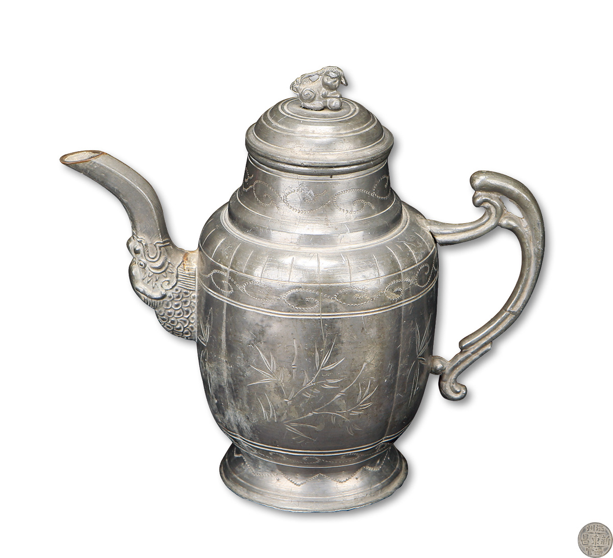 清锡刻花卉兽纹执壶一件,温州新东昌制造,高:17CM,工艺精美,保存完好
