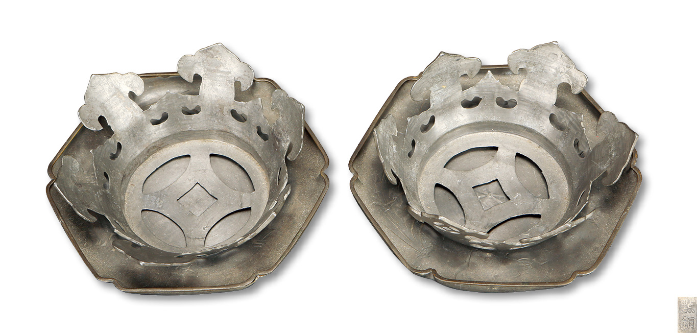 清锡制大号杯托一对,直径:11CM,可分离,设计精巧,工艺精湛,保存完好