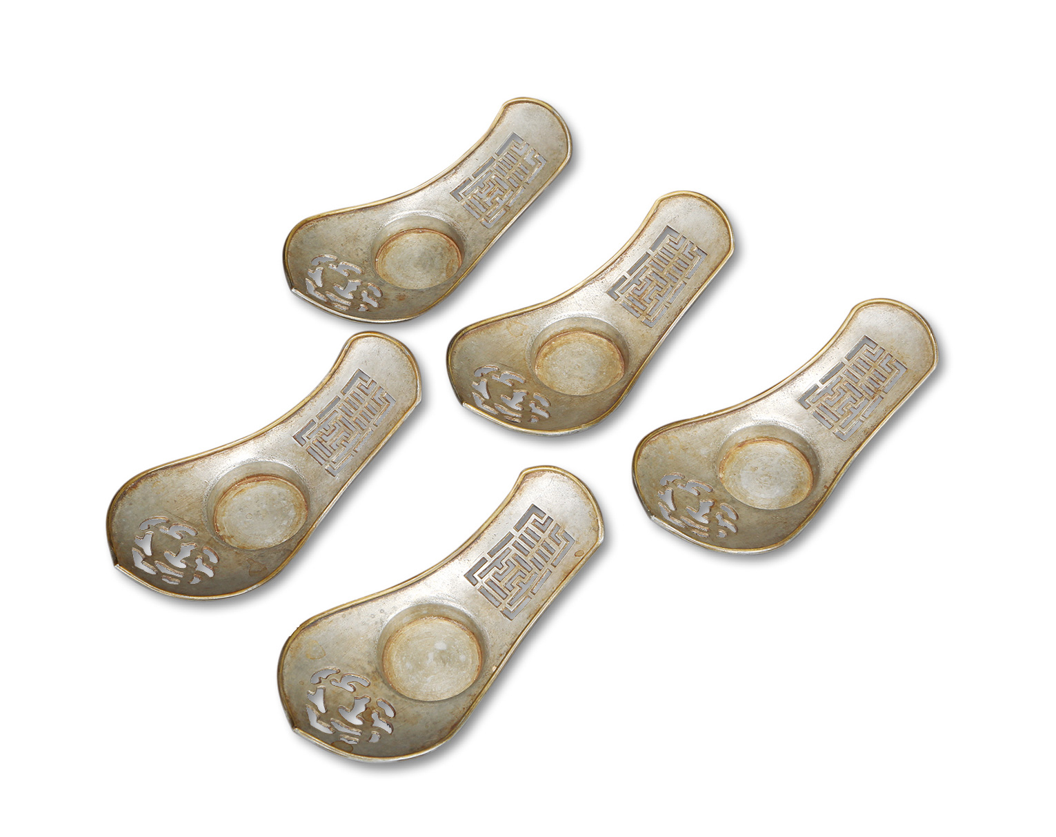 清锡制镂空雕船型茶托五件,均长:14.5CM,做工上乘,保存完好