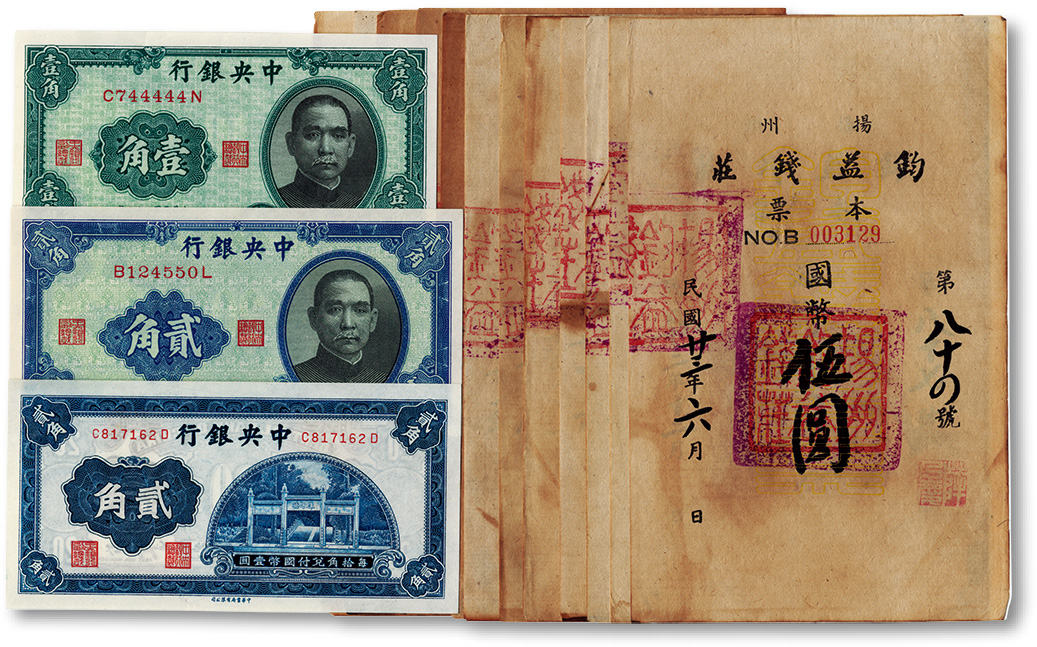 纸币一组共16枚,详分:中央银行中华版洙水桥贰角,1940年壹角、贰角;民国廿三年(1934年)扬州钧益钱庄国币本票13枚,金额均不相同;海外回流,八成至全新